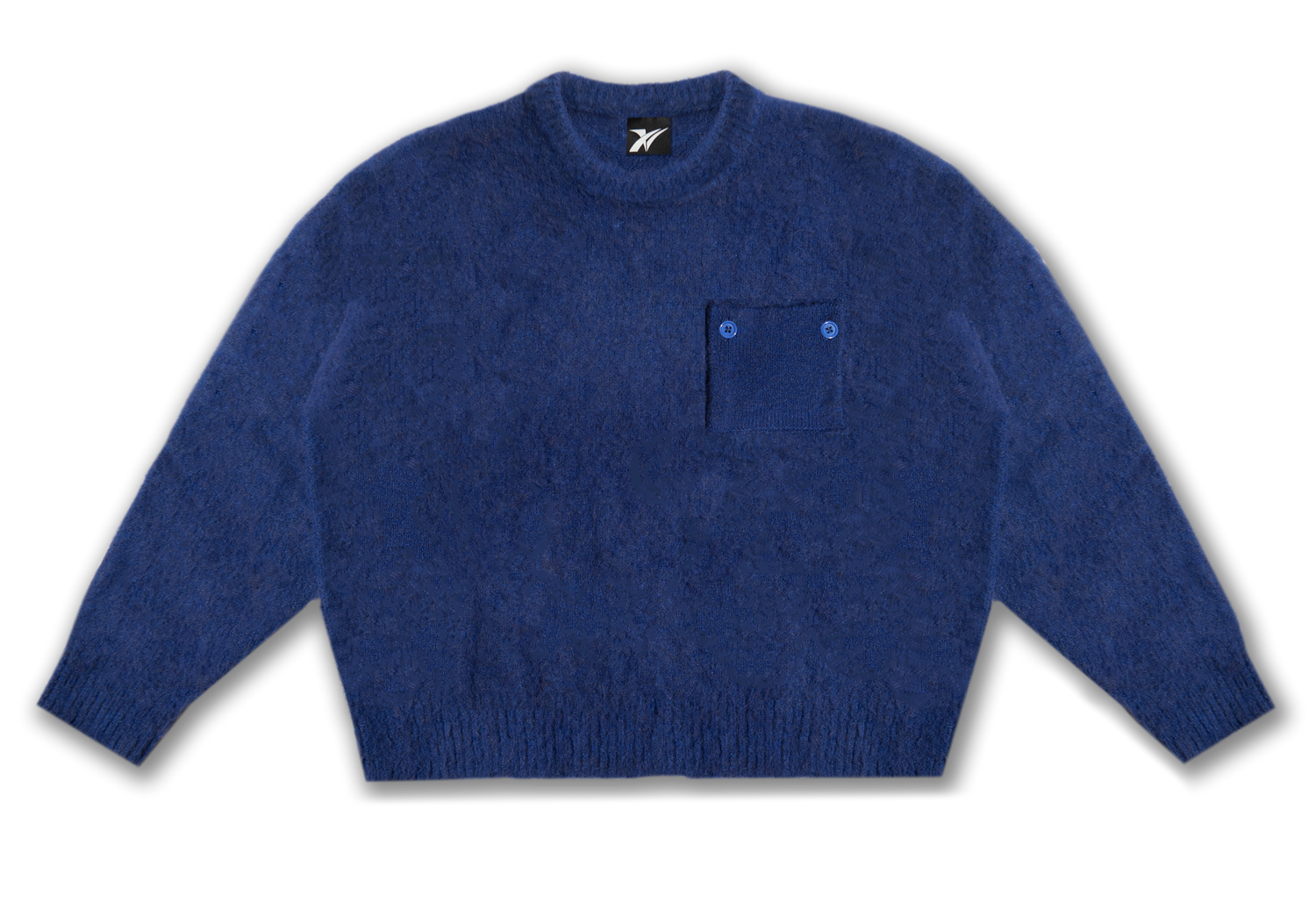 The sweater is made from ultra-soft mohair, ensuring a luxurious feel perfect for the colder nights. It features our signature stitched logo on the chest and a detachable pocket for a customizable look, blending functionality with fashion.